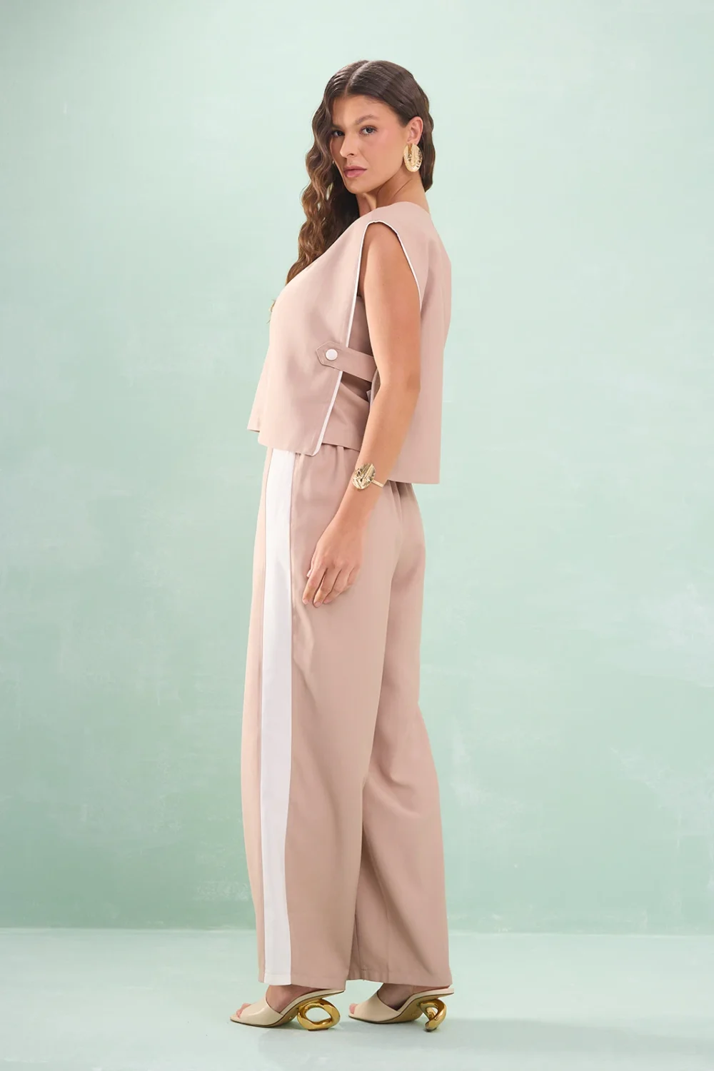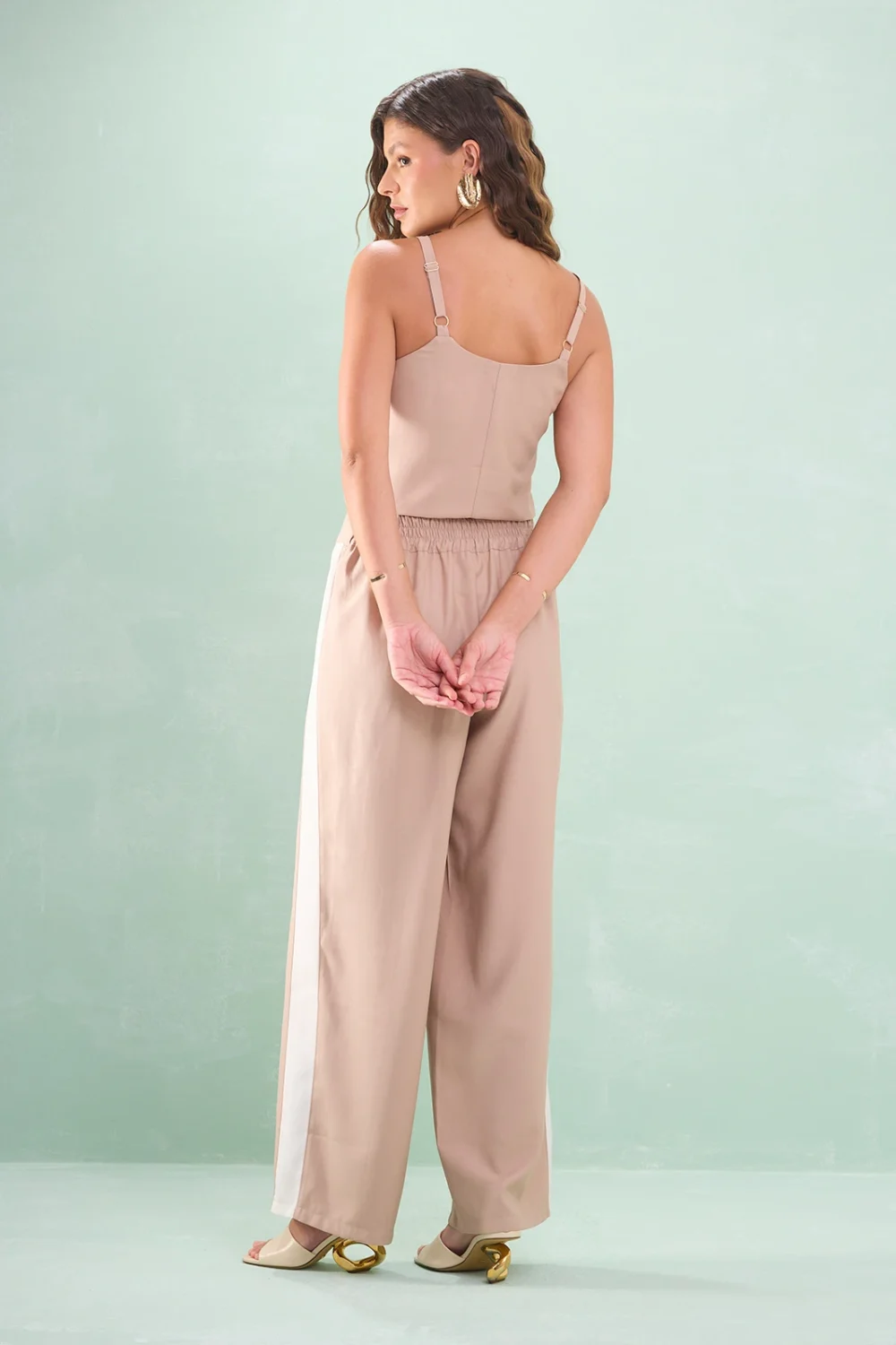 Calça Wide Leg Faixa Lateral Elástico Costas Viscose